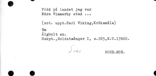 //// Född på landet jag var //// Nära Vimmerby stad ... //// (not. uppt.Carl Viking,Kråksmåla) //// Sm //// Älghult sn. //// Mskpt.ySoldatsånger I, s.265,E.U.17860. //// ^ ^^ NORD.MUS. ////