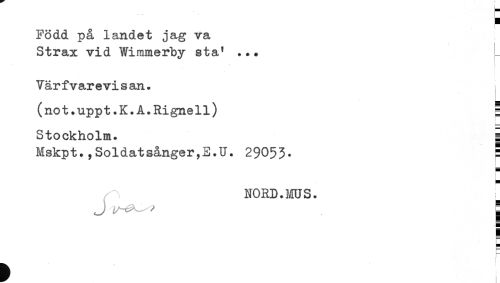 //// H //// Född på landet jag va //// Strax vid Wimmerby sta' ... //// Värfvarevisan. //// (not.uppt.K.A.Rignell) = //// Stockholm. s //// Mskpt.,Soldat sånger,E.U. 2905 3. p //// NORD.ms. //// J { //// H //// ] //// B ////