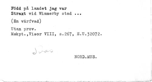 //// Född på landet jag var //// Straxt vid Wimmerby stad ... //// (En värfvad) //// Utan prov. //// Mskpt.,Visor VIII, s.26?, E.U.32072. //// i //// NORD. ms. //// ) //// ! ////