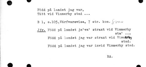 //// Född på landet jag var, //// Tätt vid Vimmerby stad ... //// B 1, s.l05,Värfvarevisa, 7 str. kom. //// Jfr. Född på landet ja'va' straxt vid Vimmerby //// i sta' ..+ //// Född på landet jag var straxt vid Vimmtrhy //// stad. //// Född på landet jag var invid Vimmerby stad. ////