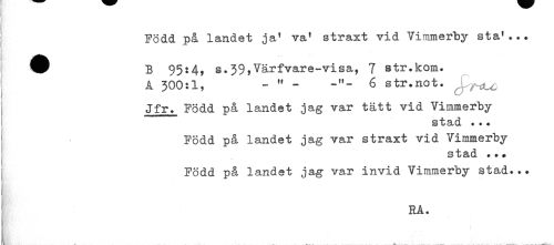 //// j //// i Född på landet ja' va' straxt vid Vimmerby sta'... //// t //// ^ B 95:4, s.39,Värfvare-visa, 7 str.kom. //// I A 300:1, - " - 6 str.not. . //// ! Jfr. Född på landet jag var tätt vid Vimmerby //// t stad ... //// ' Född på landet jag var straxt vid Vimmerby //// stad ... //// } Född på landet jag var invid Vimmerby stad... //// - //// j RA. //// k . ___.. ^ .... ____ ...... .. . ___ ////