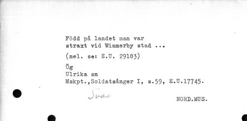 //// * ' * //// E * //// Född på landet man var //// straxt vid Wimmerby stad .. . //// (mel. se: E.U. 29183) //// v //// ög //// Ulrika sn //// Mskpt.,Soldatsånger I, s.59, E.U.I7745. //// i ////