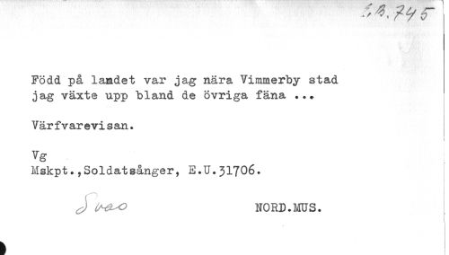 //// Född på landet var jag nära Vimmerby stad //// jag växte upp bland de övriga fäna ... //// Värfvarevisan. //// t //// Vg : //// Mskpt.,Soldatsånger, E.U.31706. //// ) ////
