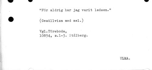 //// "För aldrig har jag varit ledsen." //// ^^ (Gesällvisa med mel.) //// t //// Vgl.Töreboda, //// 10894, s.1-3. Stålberg. //// ULHA. //// //// // -. ... ////