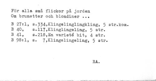 //// För alla små flickor på jorden //// Om brunetter och blondiner ... //// B 27:1, s.334,Klingelinglingkling, 5 str.kom. //// B 40, s.H7,Klinglingeling, 5 str. //// B 41, s.218,En varieté bit, 4 str. //// B 98:1, s. 7,Klingelingeling, 5 str. //// RA. ////