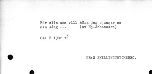 //// För alla som vill höra jag sjunger nu //// min sång ... (av Hj.Johansson) //// Se: E 1902 f^ //// ^ KB:S SKILLINGTRYCKSREG. //// < ////