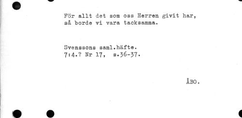 //// För allt det som oss Herren givit har, //// sa borde vi vara tacksamma. //// Svenssons saml.häfte. //// 7:4.? Nr 17, s.36-37. //// ÅBO. ////