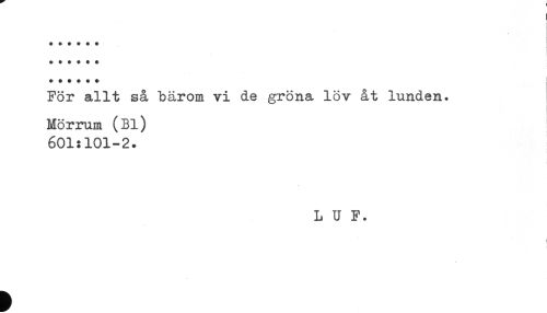 //// j //// + + * + * + //// För allt så bärom vi de gröna löv åt lunden. //// Mörrum (Bl) //// 601:101-2. //// L U F. ////