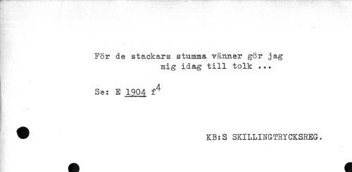 //// För de stackars stumma vänner gör jag //// mig idag till tolk ... //// Se: E 1904 f^ //// ^ KB:S SKILLINGTRYCKSREG. ////