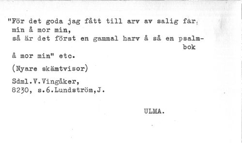 //// "För det goda jag fått till arv av salig far. //// min å mor min, //// så är det först en gammal harv å så en psalm- //// bok //// å mor min" etc. //// (Nyare skämtvisor) //// Sdml.V.Vingåker, //// 8230, s.6 + Lundström,J. //// i //// i //// t //// ULMA. //// * //// j //// i //// i //// i ////