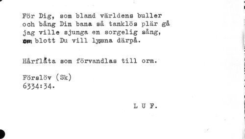 //// För Dig, som bland världens buller //// och bång Din bana så tanklös plär gå ^ //// jag ville sjunga en sorgelig sång, //// 3W blott Du vill lyysna därpå. //// 5 //// < //// c //// Hårfl&ta som förvandlas till orm. //// Förslöv (Sk) ^ //// 6334:34. //// ! //// L U F. I ////