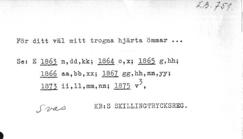 //// For ditt väl mitt trogna hjärta ömmar ... //// Se: E 1863 n,dd,kk; 1864 o,x; 1865 g,hh; //// 1866 aa,bb,xx; 186? gg,hh,nn,yy; //// 3 //// 1873 ii,11,mm,nn; 1875 v , //// ) KB:S SKILLINGTRYCKSREG. //// * //// < //// t. ////