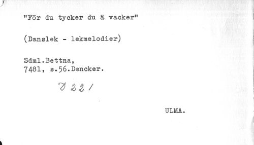 //// "For du tycker du ä vacker" //// (Danslek - lekmelodier) //// Sdml.Bettna, //// 7481, s.56.Dencker. //// < //// i //// * //// ULMA. ////