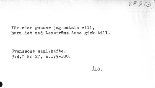 //// För eder gossar jag omtala vill, //// huru det med Lemströms Anna gick till. //// i //// Svenssons saml.häfte, //// 9:4,? Nr 27, s.179-180. //// ÅBO. ////