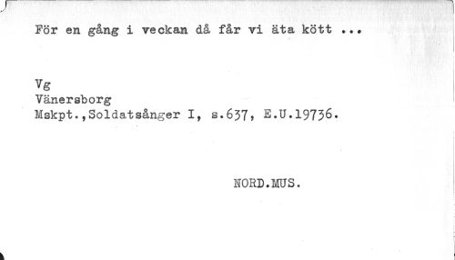 //// För en gång i veckan då får vi äta kött ... //// Vg //// Vänersborg //// Mskpt.,Soldatsånger I, s.637, E.U.I9736. //// ; ' h //// I //// f //// - //// * //// NORD.MUS. //// < //// } ////