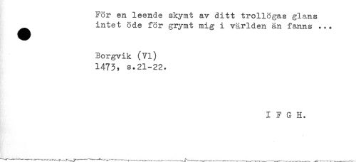 //// För en leende skymt av ditt trollögas glans //// ^ intet öde för grymt mig i världen än fanns ... //// Borgvik (Vi) //// 1473, s.21-22. //// I F G H. //// " -'---.y-- ^ ____ ////