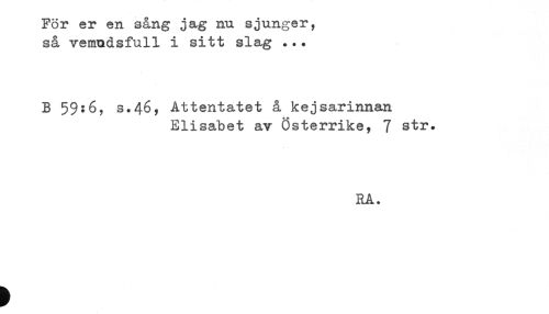 //// För er en sång jag nu sjunger, //// så vemudsfull i sitt slag ... //// B 59:6, s.46, Attentatet å kejsarinnan //// Elisabet av Österrike, 7 str. //// RA. ////