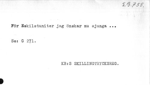 //// t //// t //// . . - ^ //// i //// < //// För Eskilstuniter jag önskar nu sjunga ... //// t //// t //// t //// i //// ) //// Se: G 271. //// t //// i //// t //// t //// i //// KB:S SKILLINGTRYCKSREG. ////