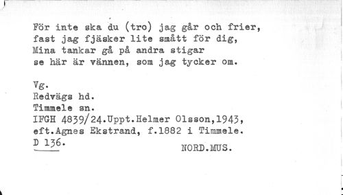 //// För inte ska du (tro) jag går och frier, //// fast jag fjäskar lite smått för dig, //// Mina tankar gå på andra stigar //// se här är vännen, som jag tycker om. //// Vg. //// Redvägs hd. //// Timmele sn. //// IFGH 4839/24.Uppt.Helmer Olsson,1943? //// eft.Agnes Ekstrand, f.1882 i Timmele. //// ^Jj^* NORD. ms. //// i //// H ////