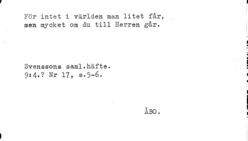 //// För intet i världen man litet får, //// men mycket om du till Herren går. //// * //// n //// Svenssons saml.häfte. : //// 9:4.? Nr 17, s.5-6. f //// H //// i //// e //// I //// ÅBO. ! //// i //// t ////