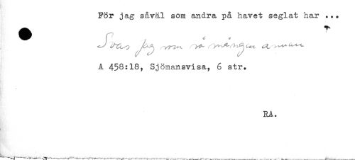 //// For jag såväl som andra på havet seglat har ... //// A 453:13, Sjömansvisa, 6 str. //// RA. //// ^^____^ ^^ ////