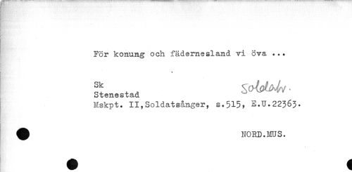 //// För konung och fädernesland vi öva ... //// p'' //// i ^ //// 3) :. //// Stenestad //// Mskpt. II,Soldatsånger, s.515y E.U.22363. //// * //// H* - ' //// //// /