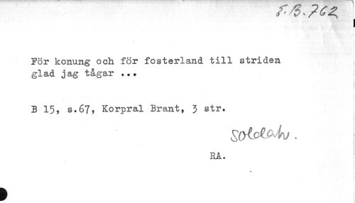 //// i //// För konung och for fosterland till striden : //// glad jag tågar ..+ //// . //// ! //// B 15, s.67, Korpral Brant, 3 str. //// f ////