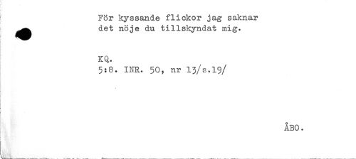 //// ! För kyssande flickor jag saknar //// ^^ det nöje du tillskyndat mig. //// KQ. //// 5:8. INR. 50, nr I3/S.I9 //// /i //// ) ////