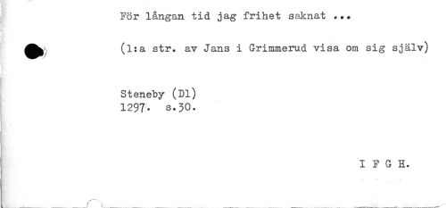 //// För långan tid jag frihet saknat ... //// ^^ (l:a str. av Jans i Grimmerud visa om sig själv) //// ! ! //// Steneby (Dl) //// 1297- s.30. //// IFGH. //// t --: //// ..... , ^ ////