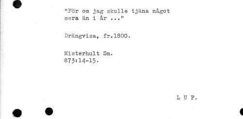 //// "För om jag skulle tjäna något //// mera än i år ..." //// Drängvisa, fr.1800. //// B'. //// Misterhult Sm. //// 873:14-15* //// L U F. ////