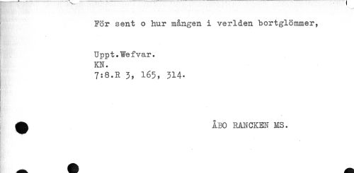 //// För sent o hur mången i verlden bortglömmer, //// Uppt.Wefvar. //// KN. //// 7:8.R 3, 165, 314. //// &*: //// T*; //// . . //// } //// ^ ÅBO RANCKEN MS. ////