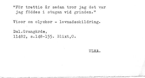 //// "För trettio år sedan tror jag det var //// jag föddes i stugan vid grinden." //// Visor om olyckor - levnadsskildring. //// Dal.Grangärde, //// 11482, s.148-155* Blixt,0. //// ULMA. ////