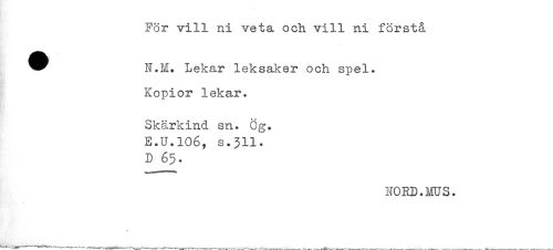 //// För vill ni veta och vill ni förstå //// ^^ N.M. Lekar leksaker och spel. //// Kopior lekar. //// Skärkind sn. Ög. //// E.U.106, s.311. //// D 65. //// NORD.MUS. ////