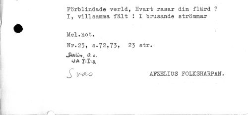 //// ; Förblindade verld, Hvart rasar din flärd ? //// j I, villsamma fält 1 I brusande strömmar //// ^ Mel.not. //// Nr.25, s.72,73, 23 str. //// I J ^uo AFZELIUS FOLKSHABPAN. //// r.....___^^___ _ ////