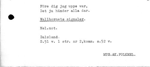 //// ! Före dig jag uppe var, //// Det ju händer alla dar. //// ^^ Wallhornets signaler. //// p //// Hel.not. //// Dalsland- //// S.51 v. 1 str. nr 2,komm. s.52 v. //// MUS.AK.FOLKMEL. ////