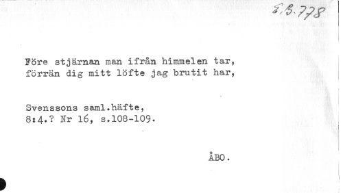 //// Före stjärnan man ifrån himmelen tar, //// förrän dig mitt löfte jag brutit har, //// Svenssons saml.häfte, //// 8:4.? Nr 16, s.108-109. //// < //// ÅBO. ////