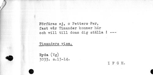 //// Förfäras ej, o Petters Per, //// fast vår Timander kommer här //// och vill till doms dig ställa ! --- //// Timanders visa,., //// Ryda (Vg) //// ^^ 3033* s.13-14. //// IFGH. ////