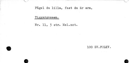 //// Fågel du lilla, fast du är arm, //// Ti^ar^ossen. //// Nr. 11, 3 str. Mel.not. //// ^ 100 SV.FOLKV. ////