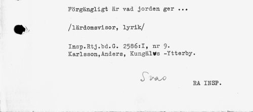 //// Förgängligt är vad jorden ger ... //// /lärdomsvisor, lyrik //// /Insp.Rtj.bd.G. 2586:1, nr 9. //// Karlsson,Anders, KungälWs -Ytterby. //// J //// RA INSP. ////