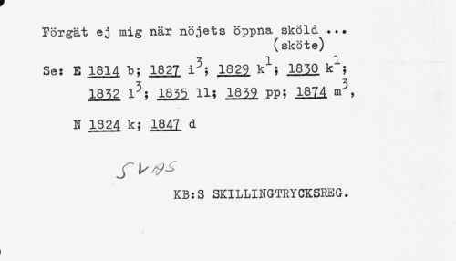 //// Förgät ej mig när nöjets öppna sköld ... //// (sköte) //// Se: E 1814 b; 1827 i^; 1829 k^; 1830 k^; //// 1852 1^; 1855 H; 1859 pp; 1874 m^, //// N 1824 k; 1847 d //// KB:S SKILLINGTRYCKSREG. ////