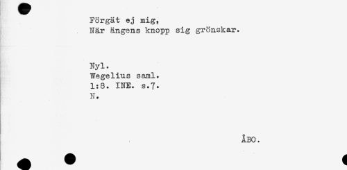 //// Förgät ej mig, //// När ängens knopp sig grönskar. //// Nyl. //// Wegelius saml. //// 1:8. INE. s.7. //// N. ////