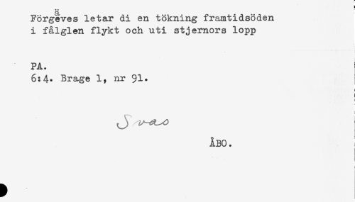 //// Förgeves letar di en tökning framtidsöden //// i fålglen flykt och uti stjernors lopp //// ! //// PA. //// 6:4- Brage 1, nr 91* //// i //// 1 //// i //// ÅBO. i ////