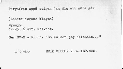 //// * //// (Landtflickans klagan) //// Myssjö. //// Nr.45y 6 str. mel.not. //// Se: SVAS - Nr.64. "Solen ser jag skinande..." //// j ERIK OLSSON MUS-HIST.MUS. ////