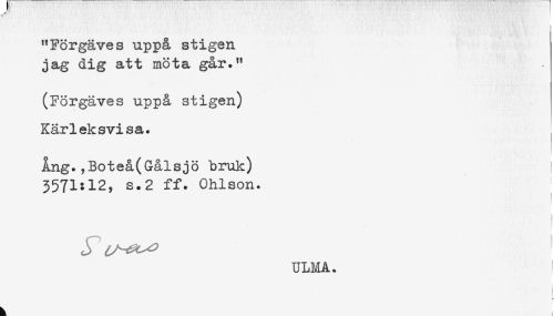 //// "Förgäves uppå stigen //// jag dig att möta går." //// (Förgäves uppå stigen) //// Kärleksvisa. //// Ång.,Boteå(Gålsjö bruk) ! //// 3571:12, s.2 ff. Ohlson. //// ULMA. ! //// [- ////