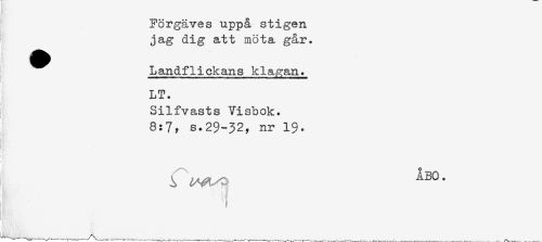 //// ^^ Landflickans klagan. //// LT. //// Silfvasts Visbok. //// 8:7, s.29-32, nr 19. //// r^o - //// 1 ////