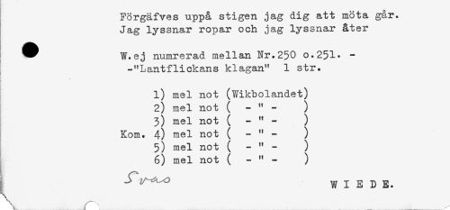//// ^ W.ej numrerad mellan Nr.250 o.251. - //// -"Lantflickans klagan" 1 str. //// ' //// f //// 1) mel not (Wikbolandet) //// 2) mel not ( - " - ) //// 3) mel not ( - " - ) //// Kom. 4) mel not ( - " - ) //// 5) mel not ( - " - ) //// i 6) mel not ( - " - ) //// } w I E D E. ////