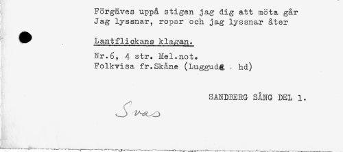 //// ' ^^ Lantflickans klagan. //// Nr.6, 4 str. Mel.not. //// Folkvisa fr.Skåne (Luggudg . hd) //// SANDBERG SÅNG DEL 1. ////
