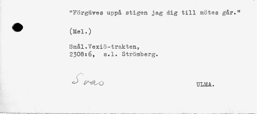 //// "Förgäves uppå stigen jag dig till mötes går." //// ^ (Mel.) //// Smål.Vexiö-trakten, //// 2308:6, s.l. Strömberg. //// ULMA. ////