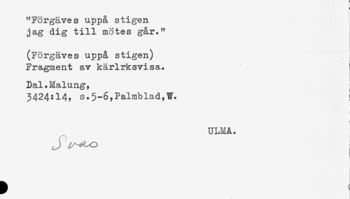 //// (Förgäves uppå stigen) i //// Fragment av kärlrksvisa. I //// Dal. Malung, ; //// 3424:14, s.5-6,Palmblad,W. ! //// ! //// ULMA. //// J ////