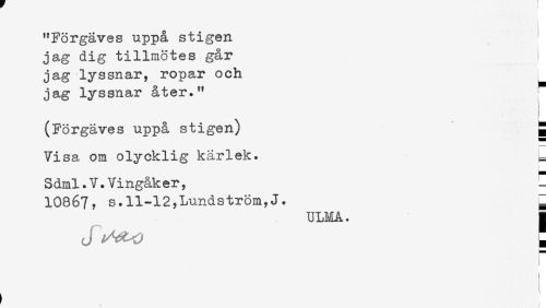 //// "Förgäves uppå stigen //// jag dig tillmötes går i //// jag lyssnar, ropar och ^ //// jag lyssnar åter." //// t //// < //// (Förgäves uppå stigen) g //// Visa om olycklig kärlek. ^ //// Sdml.V.Vingåker, - //// 10867, s.11-12,Lundström,J. ^ //// ULHA. ä //// J [ ////